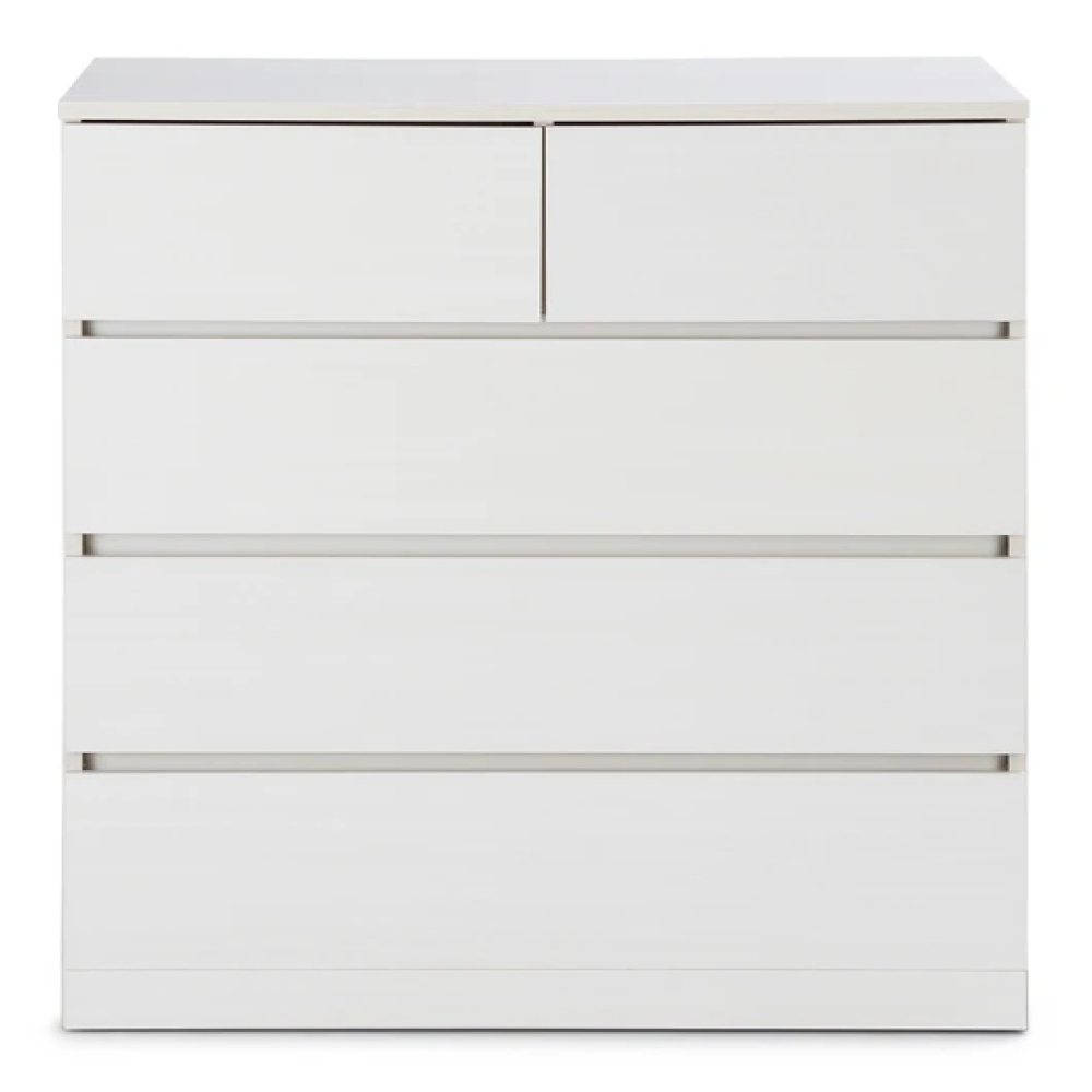 ●シンプルなデザインの木製チェストです。小引き出しが2個と大引き出しが3段のタイプです。引き出しには開閉がスムーズな金属レールを使用しています。