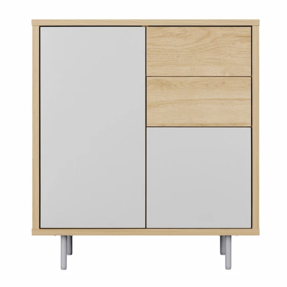 お部屋を広く魅せる奥行きがスリムなリビングキャビネットです。扉はグレーの化粧紙でアクセントをプラスし、木目調の板はインテリアに馴染みあたたかな雰囲気を演出します。収納は扉付きと引き出しの2種で抜群の収納力です。